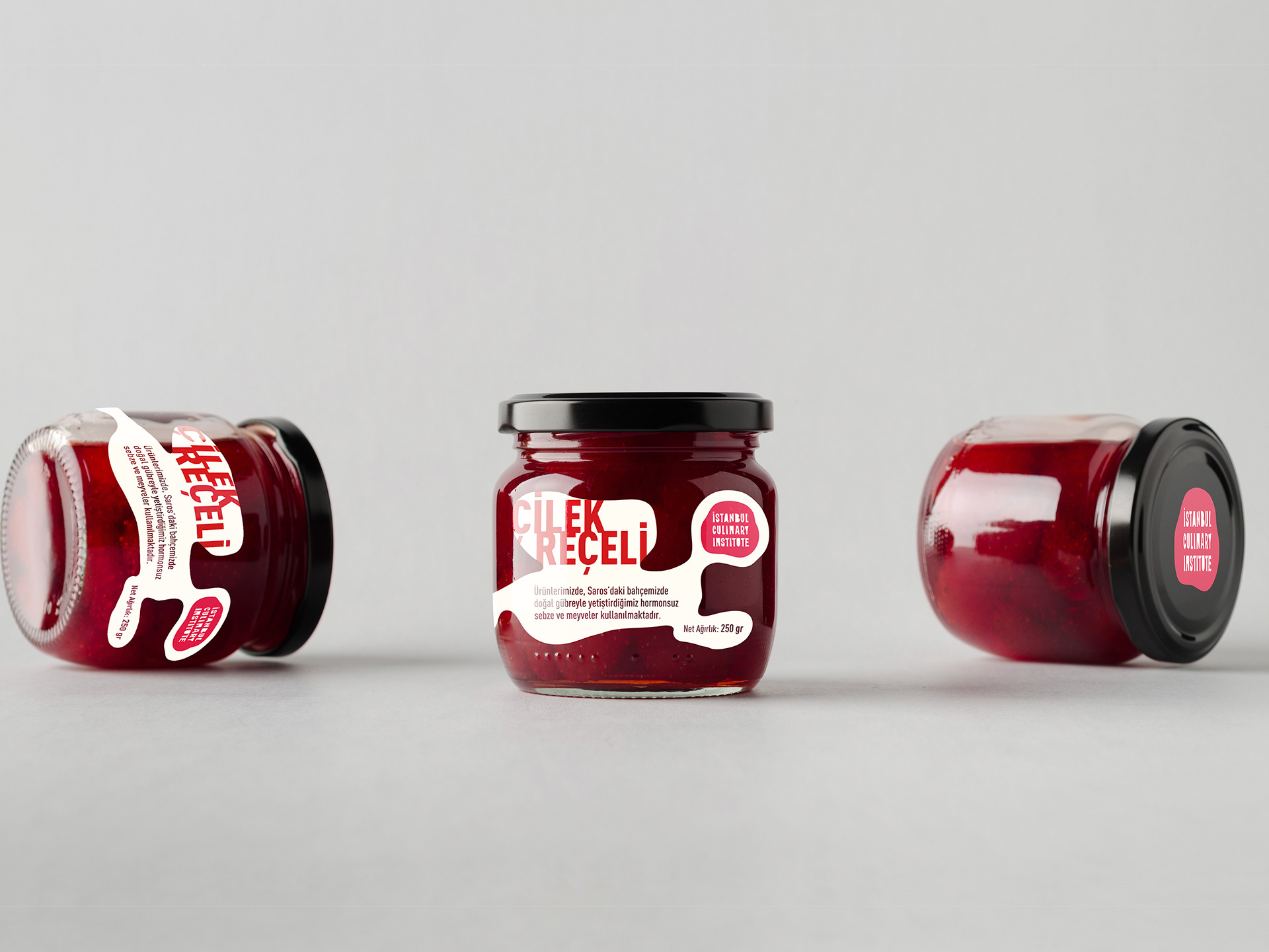 Istanbul Culinary Institute is an education and production center that researches, teaches and presents "up-to-date" Turkish and Mediterranean cuisine. In this center, which has been serving since January 2008; Cooking courses for amateurs, professional cooking, pastry and restaurant management training are offered. In addition, the Institute restaurant, which aims to make it easier for its students to gain experience and transition to professional life, is a practice restaurant that offers popular flavors with fresh ideas and creative touches. In the identity study for the Istanbul Culinary Institute, the logo design was based on the organic forms of chopped foods. In jam packaging, the labels are in a fluid form like jam, reflecting the product. The form of the label varies depending on the amount of information on it for each product.