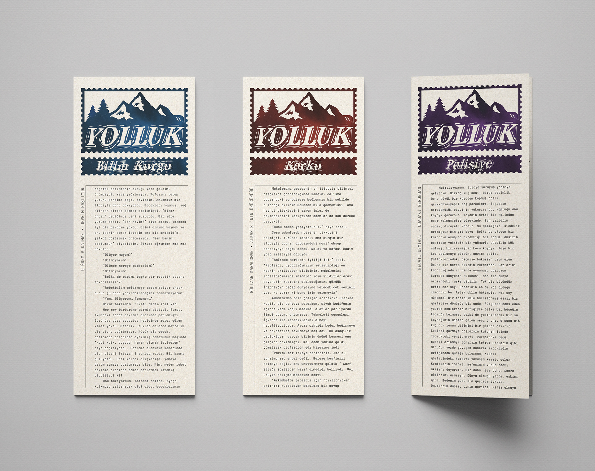 Yolluk is a publication project that is planned to appear in front of people in public transportation. It brings together the stories of amateur story writers and the illustrations produced by different illustrators for these stories. This publication, which is called Yolluk because it meets people during their travels, is designed to be folded in the form of an accordion and held with one hand for easy reading in public transport. Each issue includes works produced in different story genres such as detective, science fiction, and horror. The logo, designed in the form of stamps, is applied with a different color in accordance with the content of each issue.